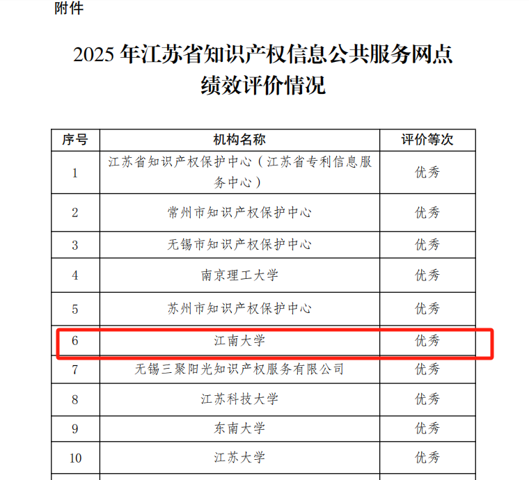 近日,江苏省知识产权局办公室正式印发《关于公布 2025 年江苏省知识产权信息公共服务网点绩效评价情况的通知》(苏知办发〔2025〕48 号),江南大学知识产权信息公共服务网点凭借在知识产权信息公共服务领域的扎实工作、创新实践与显著成效,从全省众多参评单位中脱颖而出,获评绩效评价“优秀”等次。全省共有84家机构参评,15家单位获评优秀、39家单位获评良好、30家单位获评合格。