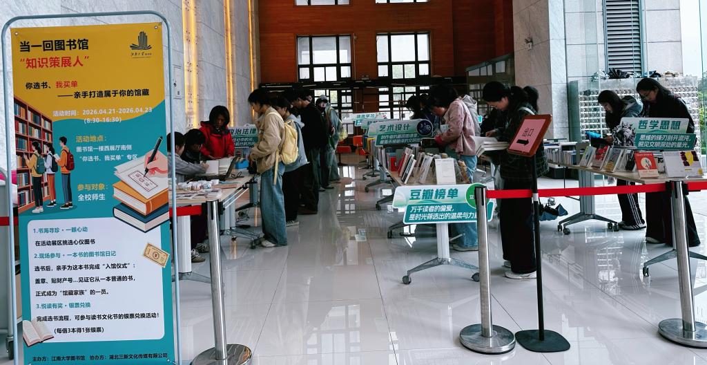 为深耕“读者为本,服务育人”办馆理念,创新馆藏文献资源建设模式,4月21日至23日,江南大学图书馆在一楼西展厅,圆满举办“你选书、我买单”知识策展人活动。本次活动作为学校第二十三届读书文化节的核心先导活动,邀请全校师生化身“知识策展人”,亲身参与馆藏资源的甄选与建设流程,精准匹配师生阅读与学术需求,让每一册新入藏的图书都蕴含读者的阅读期盼,共同营造“共建、共享、共成长”的校园阅读文化氛围。