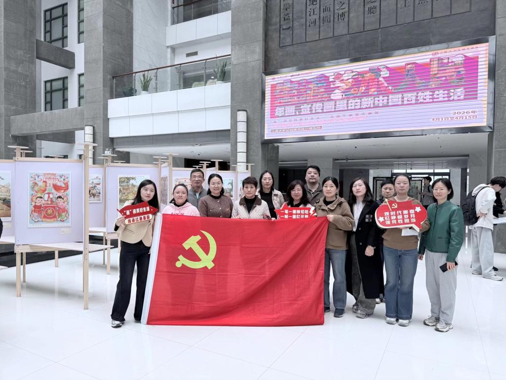 专题学习结束后,全体党员移步图书馆一楼展厅,参观“生活・艺术・人民 —— 年画、宣传画里的新中国百姓生活”主题画展。宣传委员秦彦萃结合画展的创作背景、艺术特色与时代内涵,为大家介绍了展品背后的故事。一幅幅承载时代记忆的年画与宣传画,生动展现了新中国成立以来百姓生活变迁、社会发展历程与人民对美好生活的向往。党员们在沉浸式观展中重温历史、感悟初心,画面中鲜活的烟火气与昂扬的时代风貌,让大家深切体会到了国泰民安的幸福感,进一步增强了服务师生、以文育人的动力。