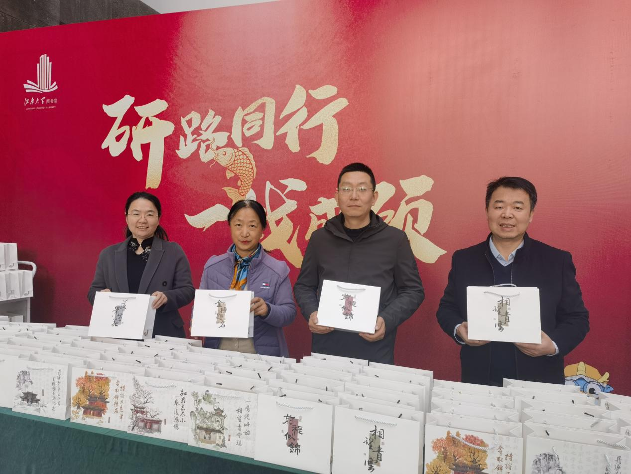 为切实满足考研学子需求,图书馆工作人员提前数周精心筹备,于一楼大厅布置了考研祝福展板,并将文具礼包与备考资料整齐摆放,供同学们领取。专属定制的考研助力大礼包上印有“嵩阳书院、白鹿洞书院、岳麓书院、应天书院”四大古代学府的文化图案,寓意学子们能够汲取深厚文化滋养,在考研路上厚积薄发。除大礼包外,现场还准备了丰富的考研、考公备考资料,每一份都承载着图书馆对学子们深深的祝福与鼓励。