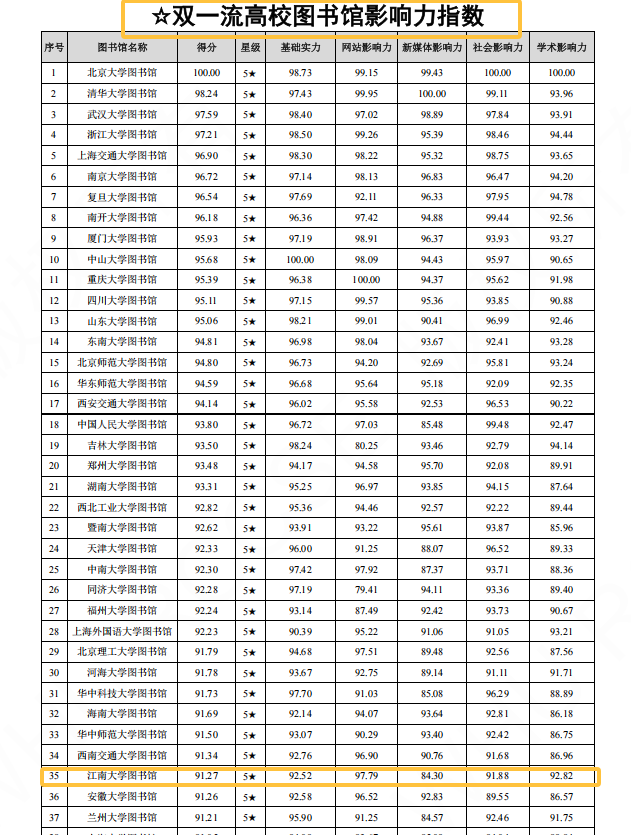 12月29日,由武汉大学中国科学评价研究中心、数字出版智能服务技术教育部工程研究中心联合研发的《数智时代中国图书馆影响力指数报告(2025)》正式发布。报告以“基础实力、网站影响力、新媒体影响力、社会影响力、学术影响力”五个维度为核心,构建科学、全面、动态的评价体系,旨在客观反映我国图书馆在数智化转型中的发展态势与服务成效。报告显示,江南大学图书馆位列全国本科院校图书馆影响力第37位,“双一流”高校图书馆影响力第35位,学术影响力已跃升至全国高校图书馆第15位,并再次获评5星等级,彰显出我校图书馆在数智时代较强的综合影响力与服务能力,也真实反映出业界对我校图情工作的充分肯定。