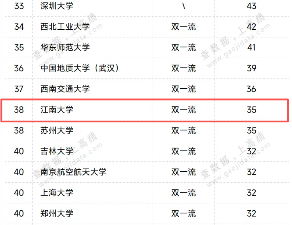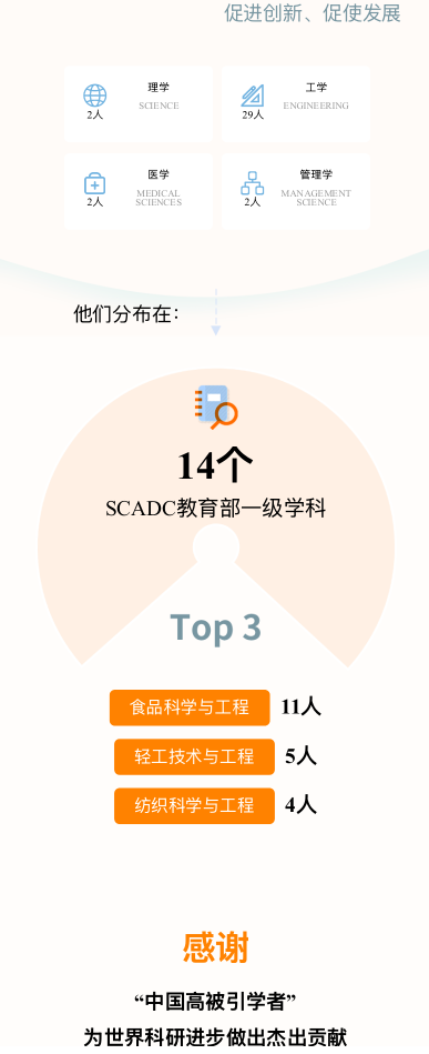 在本次高被引学者名单中,江南大学共计入选35人,涉及4个学科领域(SCADC教育部学科领域):理学2人、工学29人、医学2人、管理学2人。2025“中国高被引学者”共有401所高校上榜,我校位于第38名。